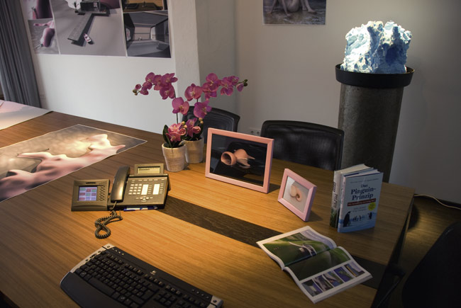The artpiece "BLUECOAST OFFICE COLOGNE" is a complex installation which consists of diffrent artpieces such as skulptures, prints, and videos, but also collected material, like books, furniture, found footage video, diagrams and so on, some of them are resampled.