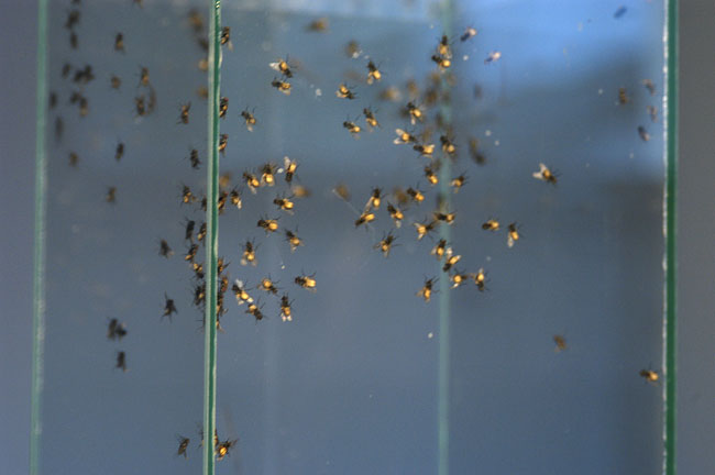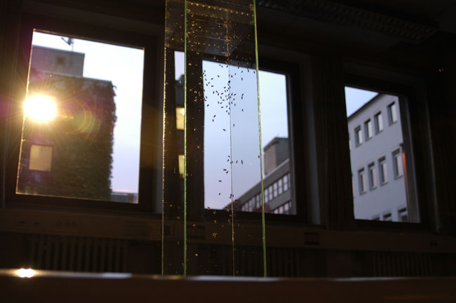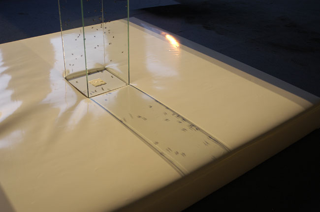 the bottom of an open glass cube. For the flies the